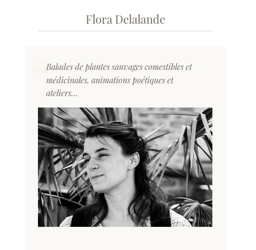 Depuis 2018, Flora se dédie entièrement à ses deux passions : la poésie et les plantes sauvages. Les événements se sont multipliés et le temps était venu de pouvoir proposer un site plus professionnel et, surtout, de pouvoir vous proposer un agenda regroupant l'ensemble des événements.