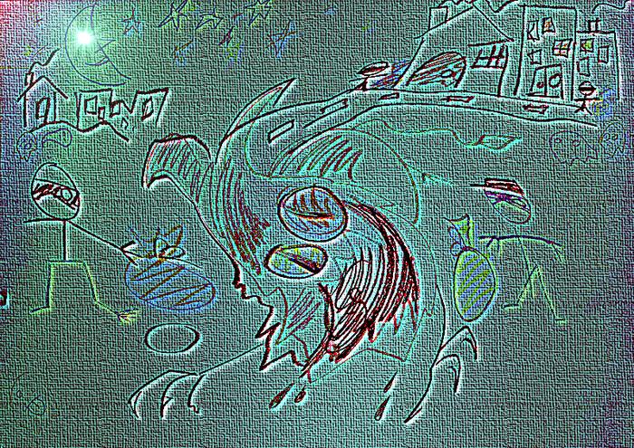 Dans le brouillard timide, leur haleine tache le ciel et leurs mains, avides, raflent les biens d'autrui. Une étrange lueur, orange dans le ciel gris, dessine des ombres sur leurs visages fermés. En mouvements mécaniques, ils amassent leurs trouvailles dans les entrailles d'une bête qui grogne à côté d'eux. Leur besogne est réglée, calculée, presque chorégraphique. Les signes qu'ils se font n'ont pas besoin de cri et le monstre ronflant obéit sans broncher. Ils passent d'un porche à l'autre, dévalisent les immeubles de leur or éphémère. Leurs butins vomissent d'abondance, et le goût du méfait coule le long de leurs doigts. Les habitants des villes dorment innocemment. Et la danse des voleurs continue sans un bruit. Les larcins volent, d'un fantôme à l'autre, en un relais mystérieux, pour finalement échouer dans la gueule béante d'un Méphistophélès. La profusion déborde et vomit un jus brun qui traîne sur la route. Les lambeaux de pétrole froissés se déchirent entre les dents du monstre souverain et c'est une salive nauséabonde, des filets de bave poisseuse, qui dégoulinent le long des rues.