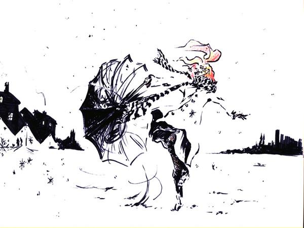 Alors elle se met à courir, vers son destin ou vers le vide. Elle se met à courir au rythme de ses rires, sur le tempo de la folie. Elle danse entre les êtres, voltige entre les doigts de la ville affolée, file sous la jupe du monde et se faufile entre les flocons argentés.