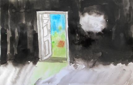 Une main coupée, des doigts rigides Et un tableau troué, de guingois, sur le mur.