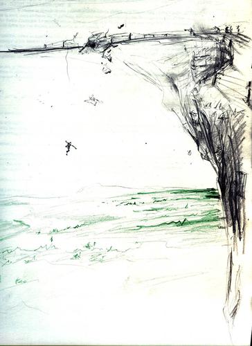Le premier avance, les bras tendus en croix, comme pour repousser des parois invisibles sur lesquelles il ne peut s'appuyer. Vu du ciel, il n'est qu'un trait horizontal qui oscille, fébrile, au-dessus du néant. Les bras tendus en croix, il anticipe la chute qui lui mordille les sens. Il avance, le rayon de ses yeux projeté vers l'avant.